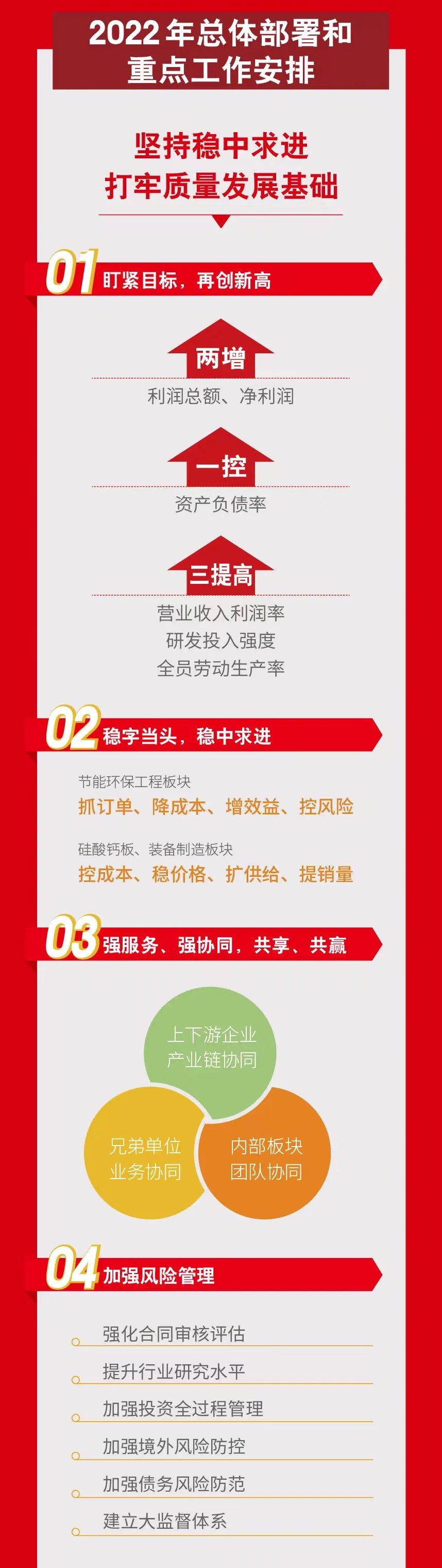 2月14日,中材節能股份有限公司召開2022年度工作會議,工作會議上總結回顧了公司2021年的工作情況,研究部署了2022年重點工作,干貨滿滿,下面讓我們通過一圖讀懂來了解工作會議的主要內容吧!