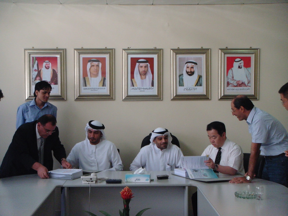 中材節(jié)能市場部部長王毅及市場經(jīng)理李浩、劉志斌、洪會林等與阿聯(lián)酋UCC水泥公司董事長Mr.Rami、總經(jīng)理Mr.Yasir、生產(chǎn)廠長Mr.Ibrahim、項目經(jīng)理Mr.Nasser及業(yè)主方咨詢顧問共同見證了這個歷史時刻。